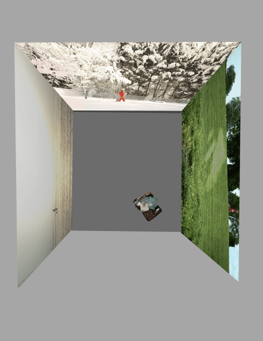 Mockup No.1 projects three single channel videos onto three contiguous or nearby walls. The trolley bag sits in near space to the third (grass) scene. The small monitor positioned inside the trolley bag hosts the fourth video.