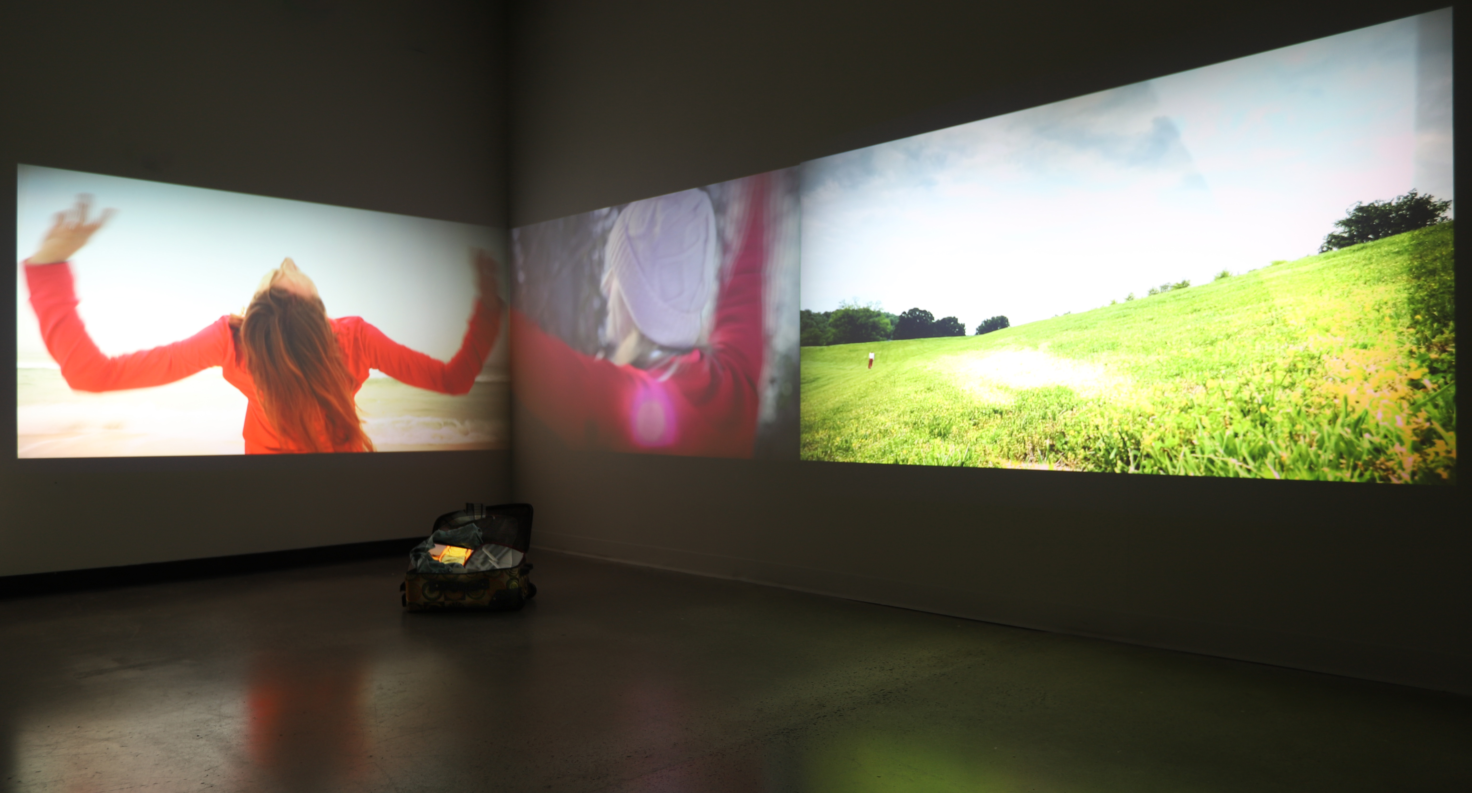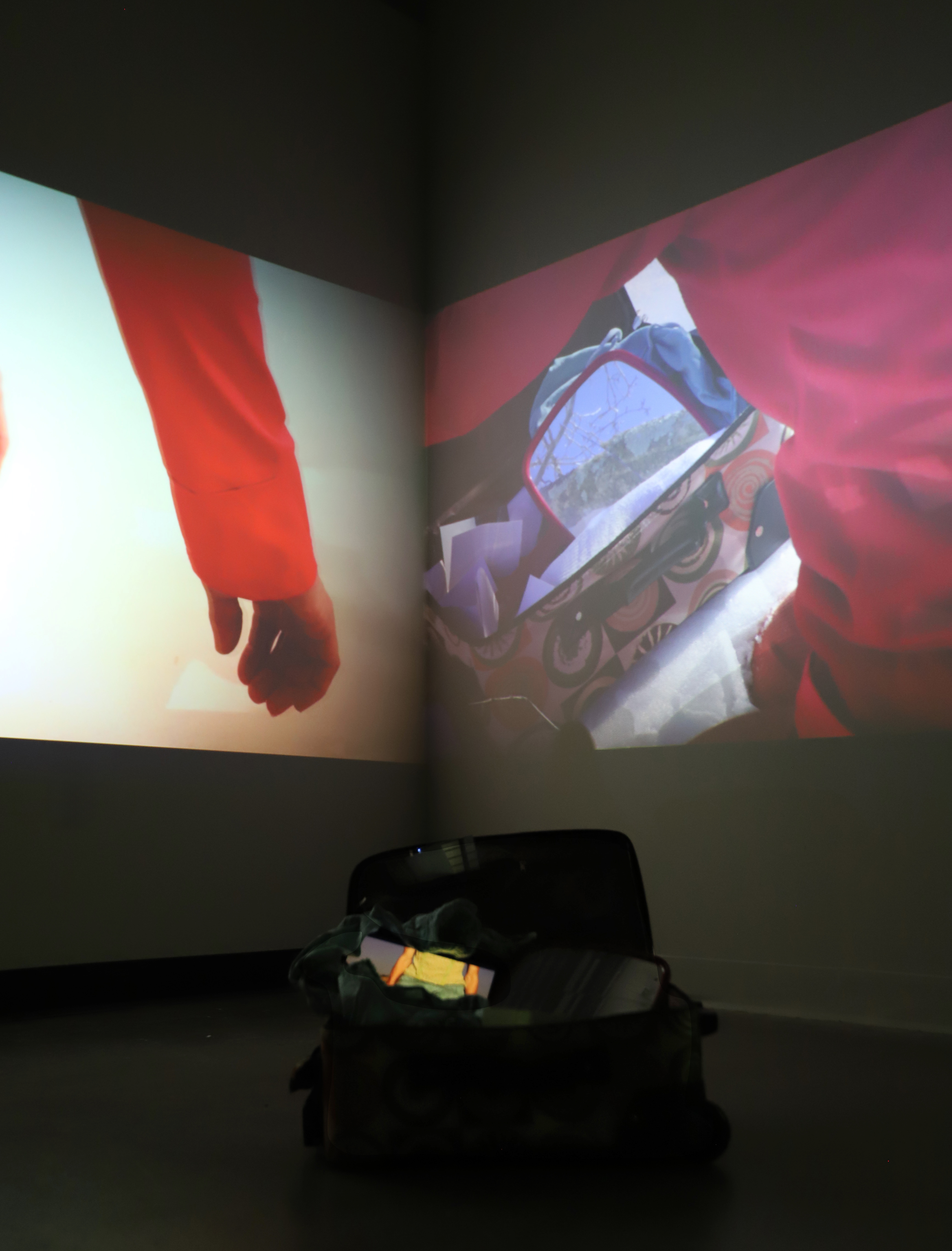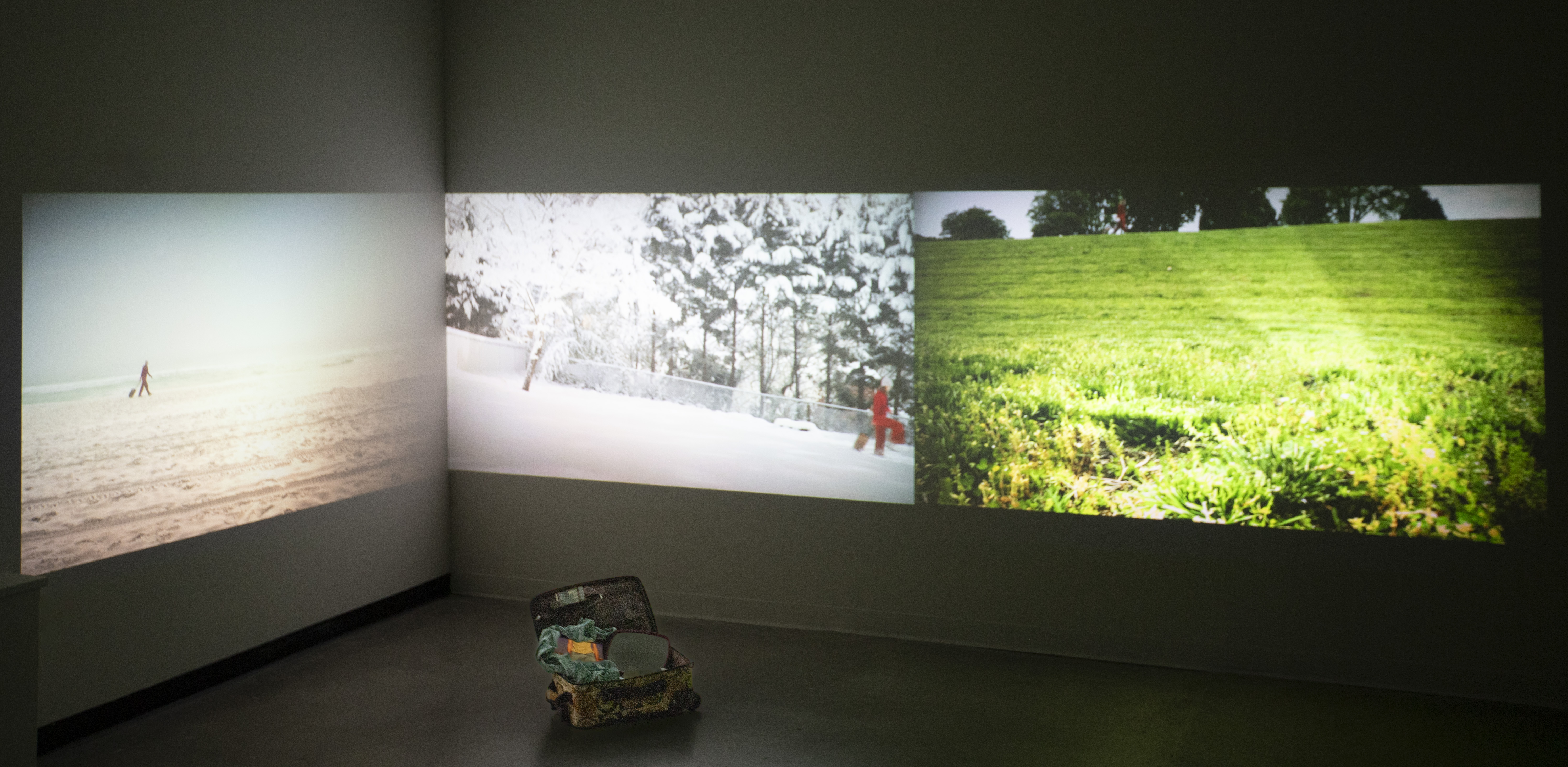 Quest for Resolve is an immersive video installation thirteen years in the making. Three single channel video projections fill three walls. In the exhibit, time collapses with the presentation of the trolley bag (pictured in the projections on the wall) now resting in the gallery space. It is a vessel containing evidence of the journey taken. Within the bag rests a small screen, a site for the video that began the quest.