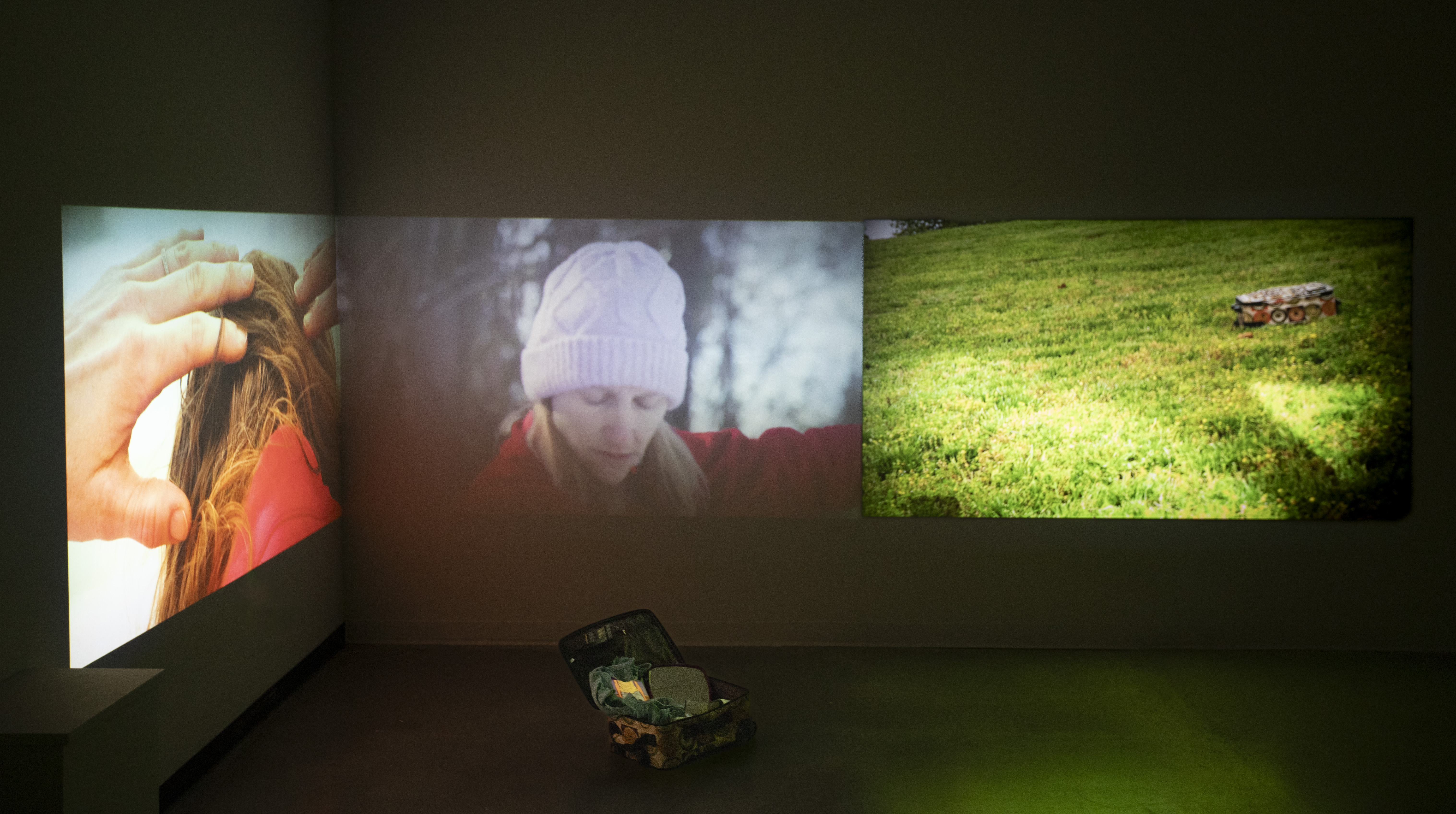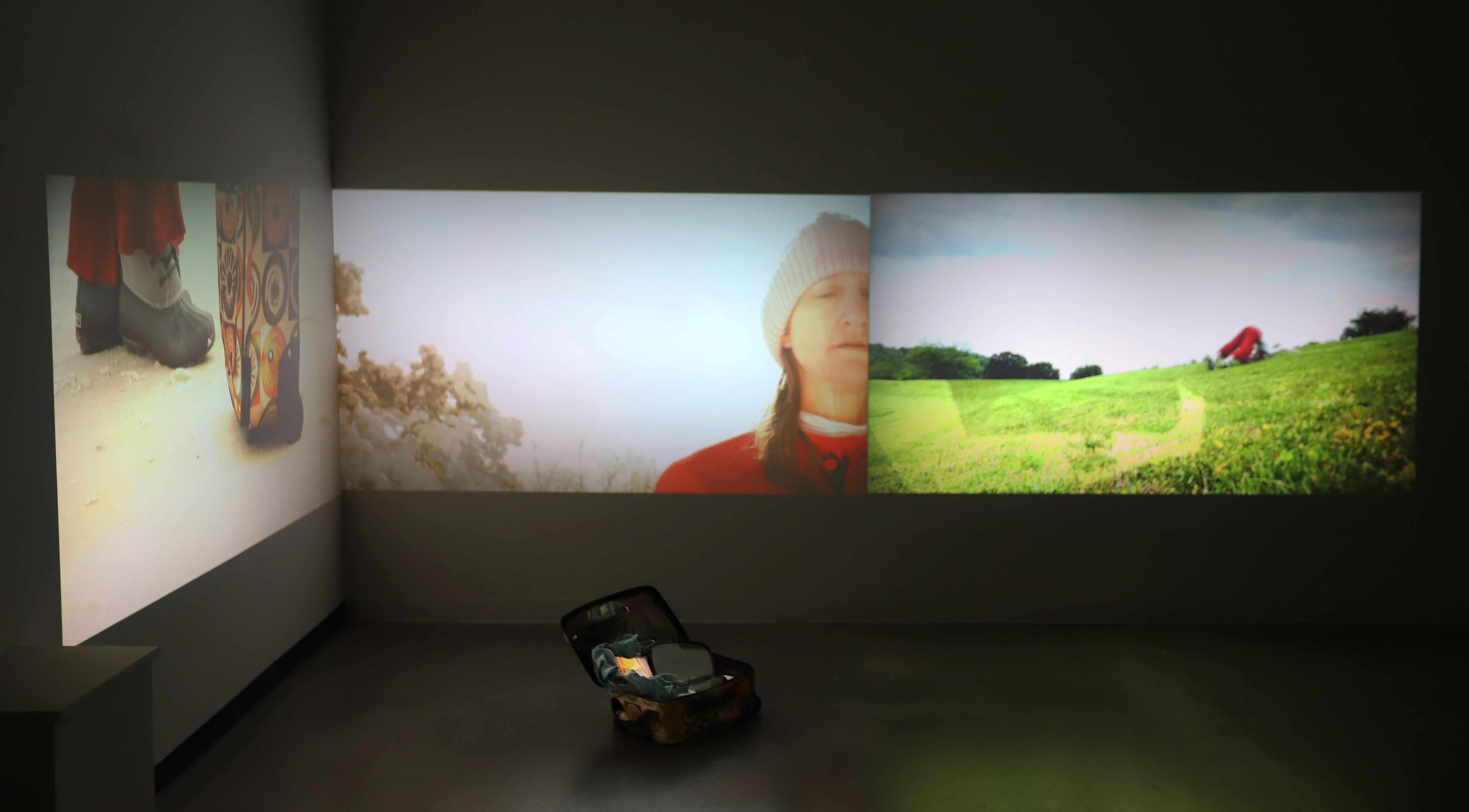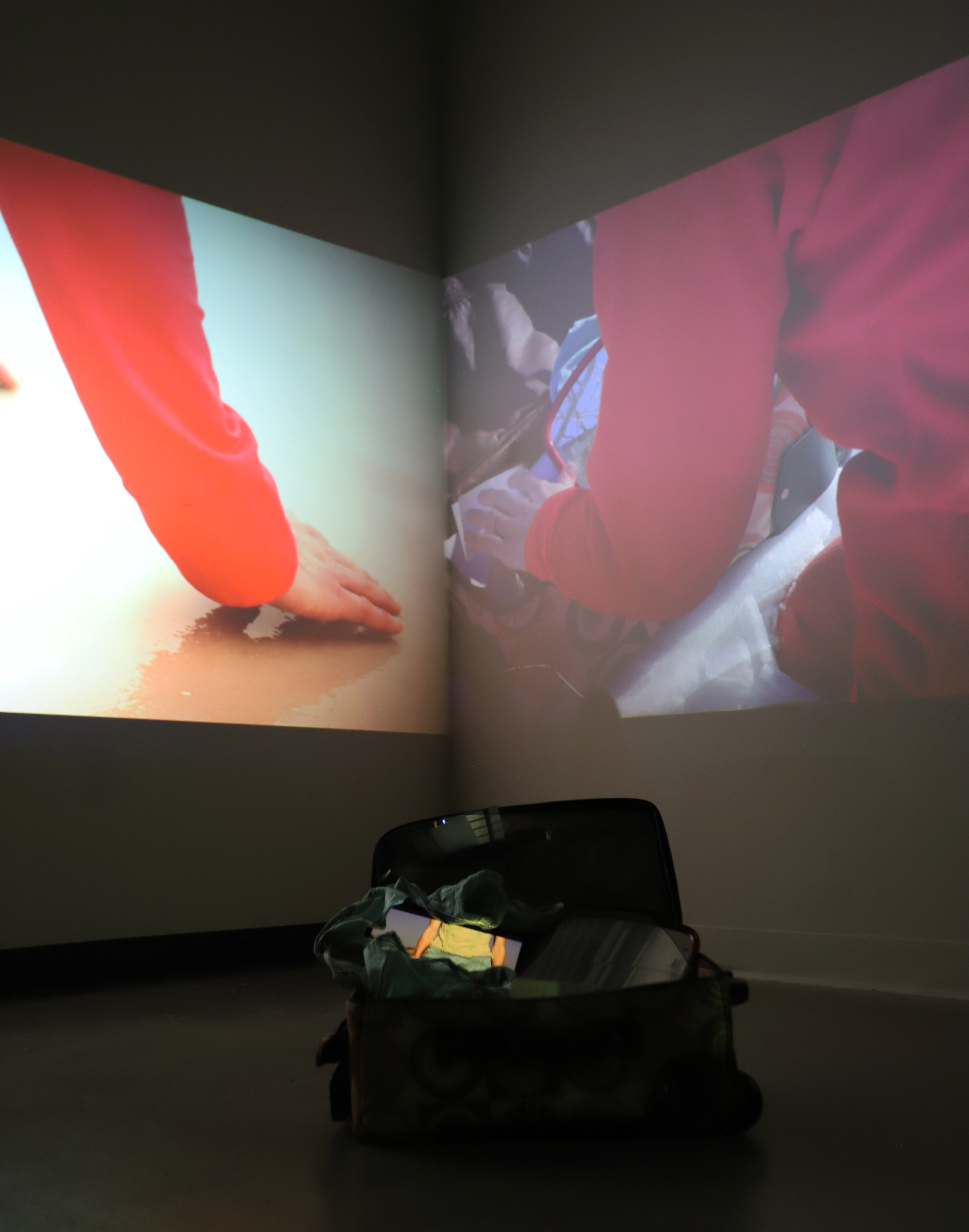 Quest for Resolve is an immersive video installation thirteen years in the making. Three single channel video projections fill three walls. In the exhibit, time collapses with the presentation of the trolley bag (pictured in the projections on the wall) now resting in the gallery space. It is a vessel containing evidence of the journey taken. Within the bag rests a small screen, a site for the video that began the quest.